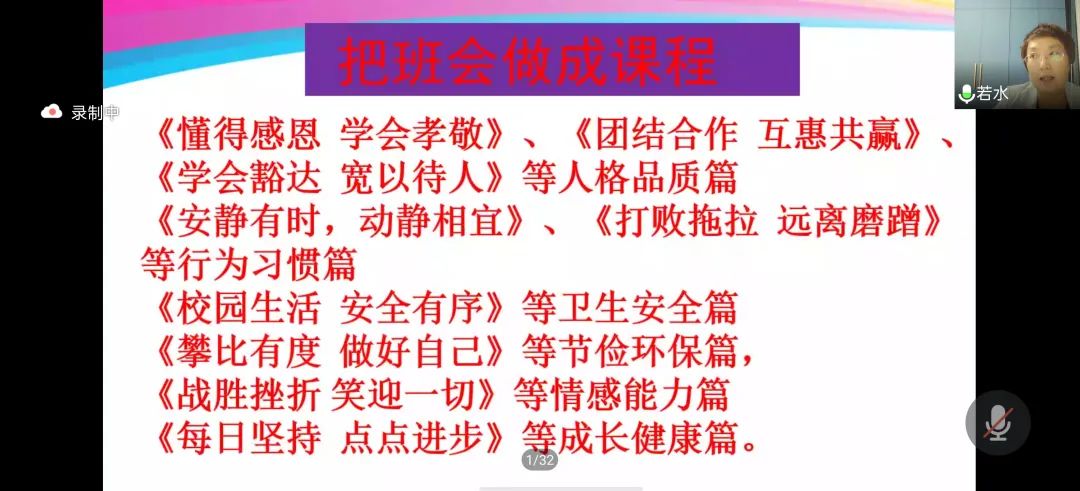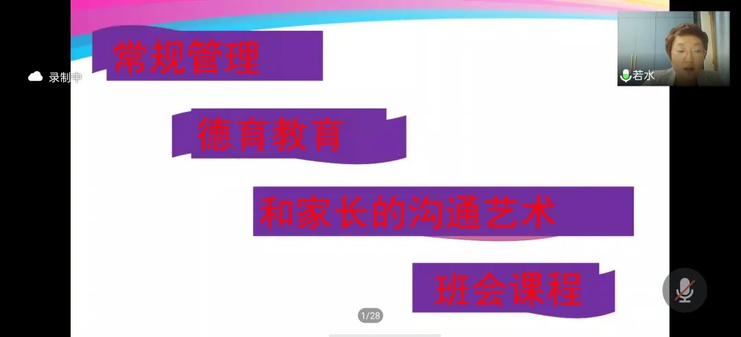 王老师从常规管理、德育教育、和家长的沟通艺术、班会课程四个方面进行深度讲解。