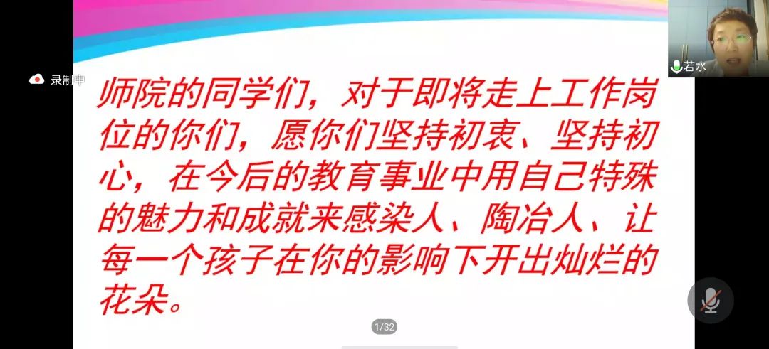 最后,王老师真切地祝愿对于即将走上工作岗位的师院学子们,愿其坚持初衷,坚持初心,在今后的教育事业中用自己特殊的魅力和成就来感染人,陶冶人,让每一个孩子在优秀的教育下开出灿烂的花朵。
